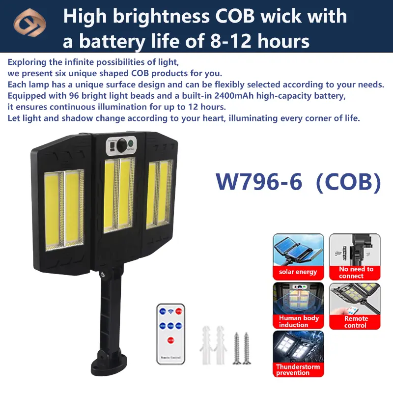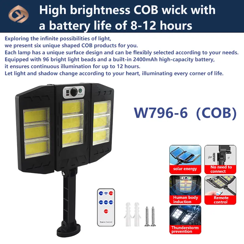 This solar light has 6 different appearances, which can be selected according to market demand. They have the same lumen and illumination levels. Waterproof, energy-saving and easy to install. Eliminates the trouble of wiring and maintenance. There are three modes to switch between. Equipped with a remote control for remote switching.
