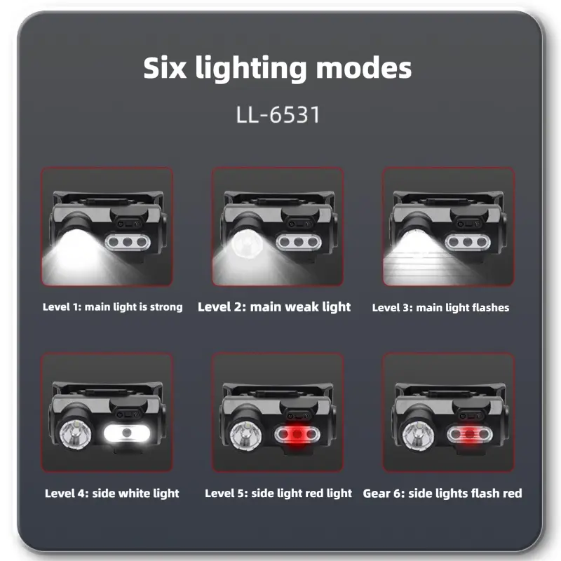 6-Mode Rechargeable Headlamp! Wholesale hot seller with Spotlight (long-range) & Floodlight (wide coverage) for outdoor, work, camping. Red Light & Red Strobe for night safety, hunting, running—no glare. Durable, lightweight, waterproof. Perfect for outdoor gear shops, tool retailers, sports stores. High-quality LED, long battery life. Bulk pricing available, low MOQ. Ideal for resale—multi-scene use boosts customer demand. Grab this versatile headlamp wholesale now! Key words: 6-mode headlamp, spotlight, floodlight, red light, red strobe, wholesale, outdoor gear, work light, camping headlamp, safety light, bulk headlamp.