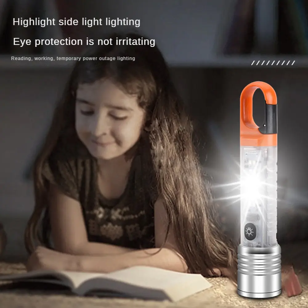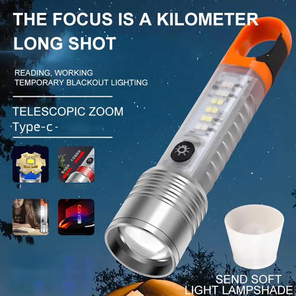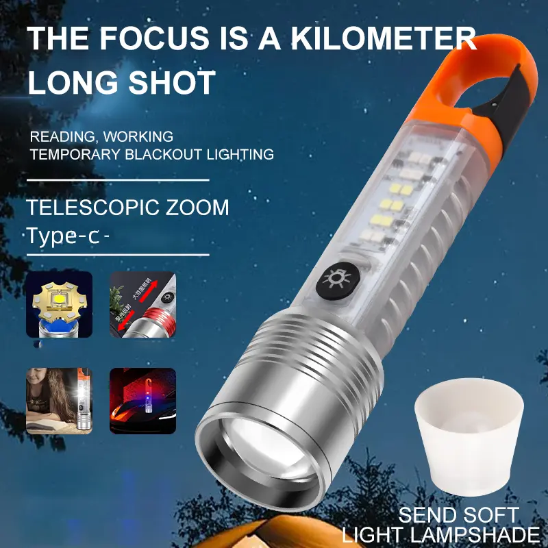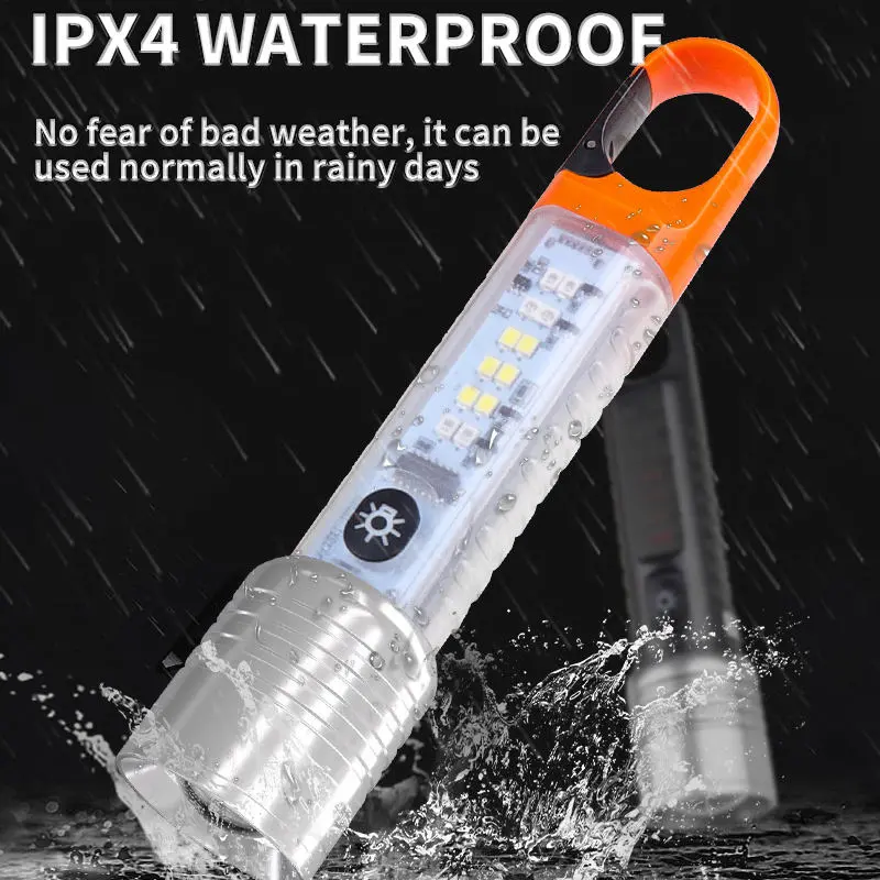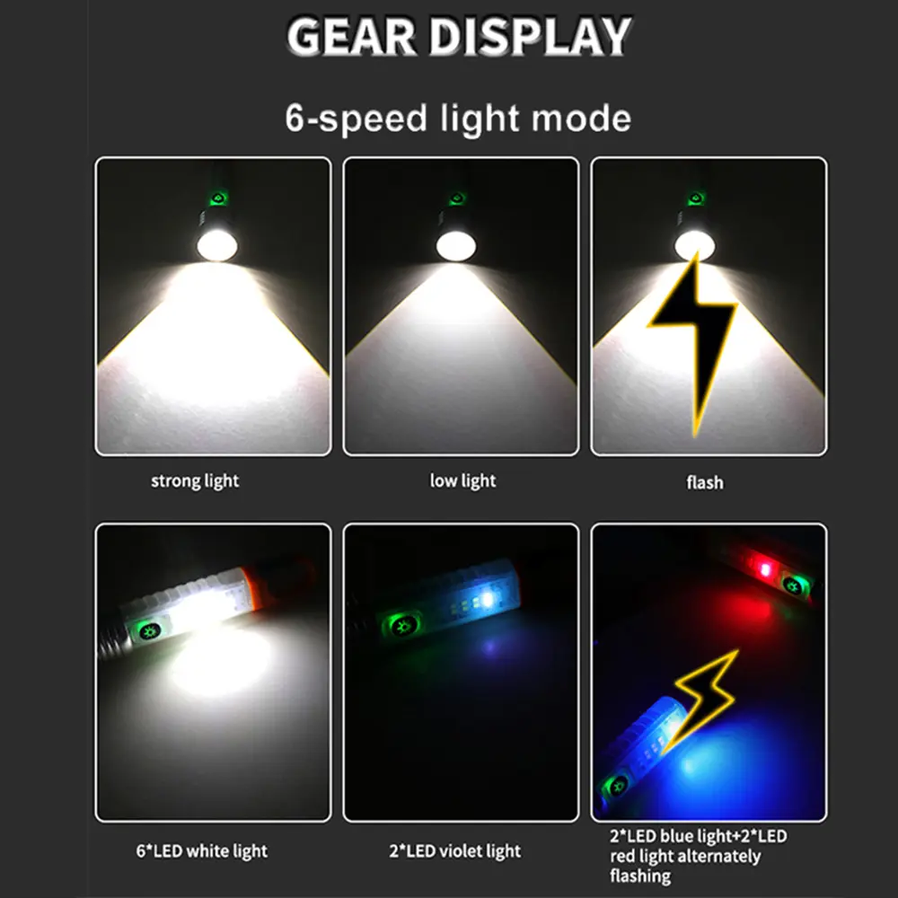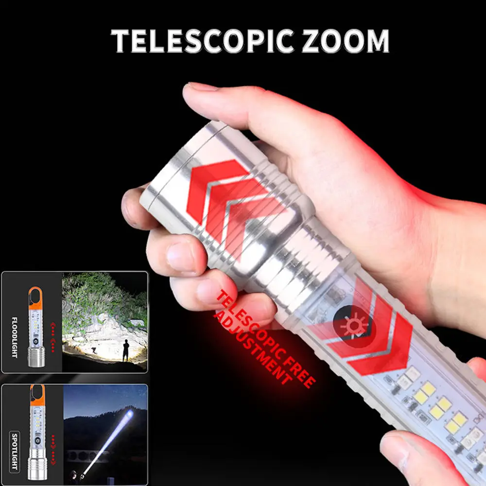 This white laser flashlight allows you to shine in the dark. There are front and side lights designed to meet your lighting needs in different scenes. The front lights adopt white laser technology, which can illuminate a large area and achieve zoom high beam, allowing you to see farther and clearer at night. The side lights have three modes: floodlight, purple light, and warning light, to cope with various complex environments.