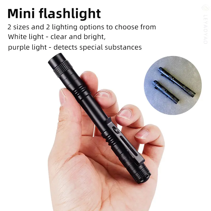 When it comes to reliable lighting in various situations, a strong flashlight is an essential tool. This mini LED tactical flashlight is made of durable aluminum alloy, which can withstand harsh usage environments and provide a powerful beam of light when needed. This flashlight is a practical and efficient choice for outdoor activities, emergency situations, and medical purposes. Its white or purple light bulb emits a strong 120LM beam, providing ample illumination for a range of tasks. This flashlight has reliable performance, simple switch function, easy to use, and is suitable for various applications. In addition to its sturdy structure and powerful light output, this flashlight also has practicality and convenience. Its compact size and lightweight nature make it easy to carry and store, ensuring it is always available when needed.