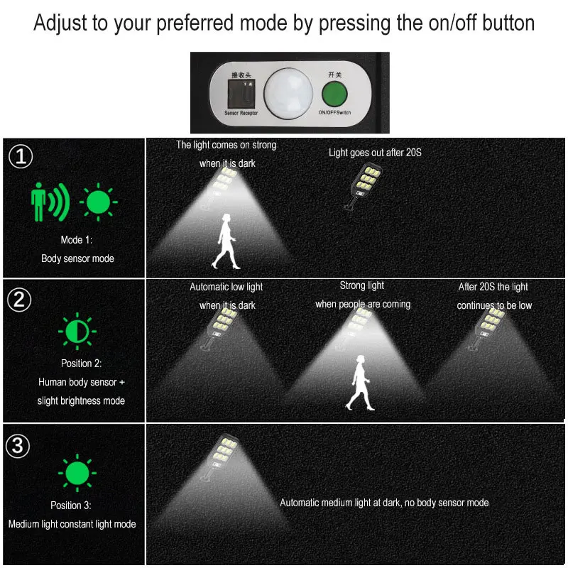 This solar powered lamp adds convenience and comfort to your life. There are two fashionable styles for you to choose from, whether it is simple or luxurious, which can meet your taste. Three modes can be switched freely, and the induction mode allows you to turn on the lights when people come and turn off the lights when people go, saving energy and being intelligent. The induction plus dimming mode keeps the lights slightly lit when you leave, providing continuous lighting for your living space. When people approach, the lights immediately turn on, bringing convenience to your life. There is also a third mode that maintains a brightness of 30% all the time, with soft and unobtrusive lighting, creating a warm and comfortable living environment for you. At the same time, it is equipped with a remote control, allowing you to switch on and off the lights anytime and anywhere within a range of 7-10 meters, no longer limited by distance and angle. Choose this solar powered light fixture to make your life more convenient and comfortable.