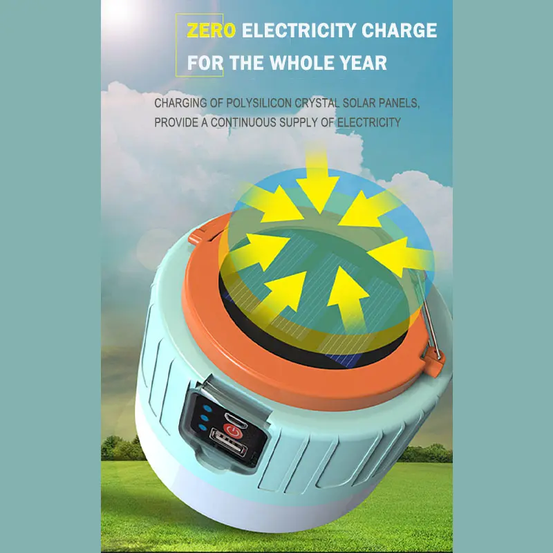 The camping light uses solar charging technology and does not require batteries or power. It can be automatically charged simply by placing or hanging it in a sunny place. At the same time, the waterproof design of the lamp allows you to use it in all kinds of bad weather without worrying about rain or short circuit of the lamp.