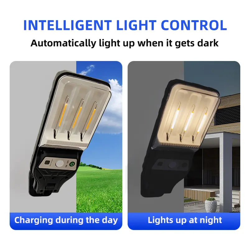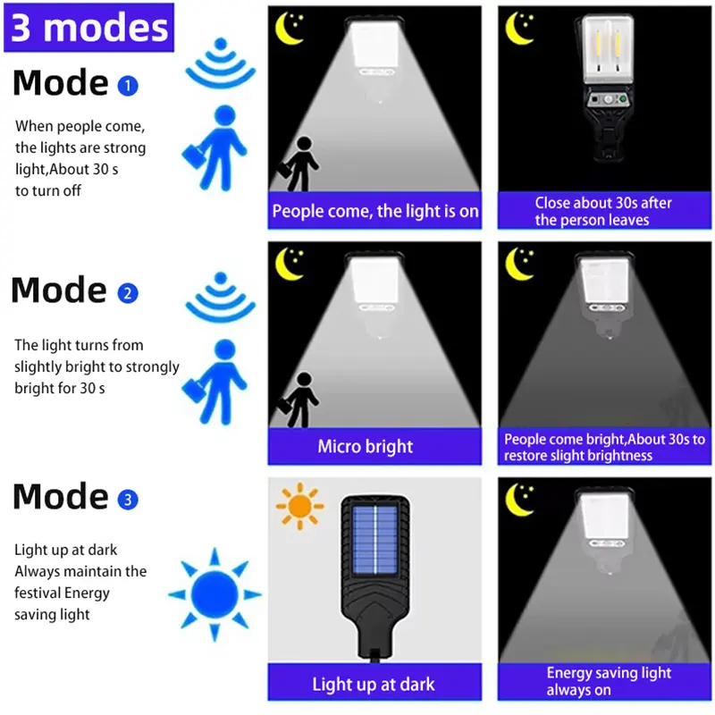 This solar LED induction wall light is made of high-quality ABS, PS and solar silicon panel materials. One of the main advantages of this product is its human sensing function, which makes them light up when someone approaches and dim when someone leaves. This not only improves safety, but also saves energy by ensuring that the lights are activated only when needed. In addition, these solar lights have three different modes, providing flexibility and customization to meet various lighting requirements. And it can also be adjusted with a remote control, which increases its convenience and expands the reliable and efficient outdoor lighting solution.