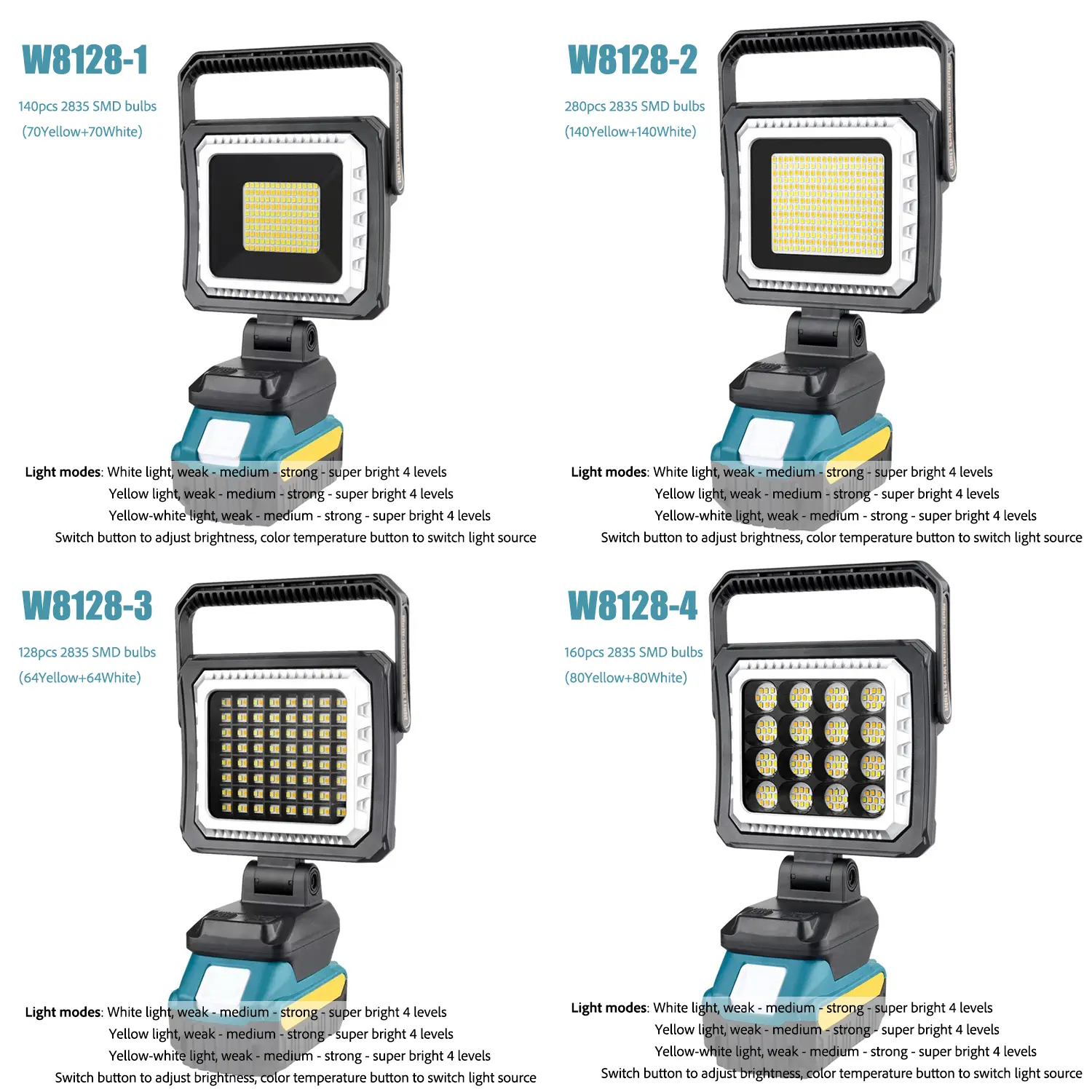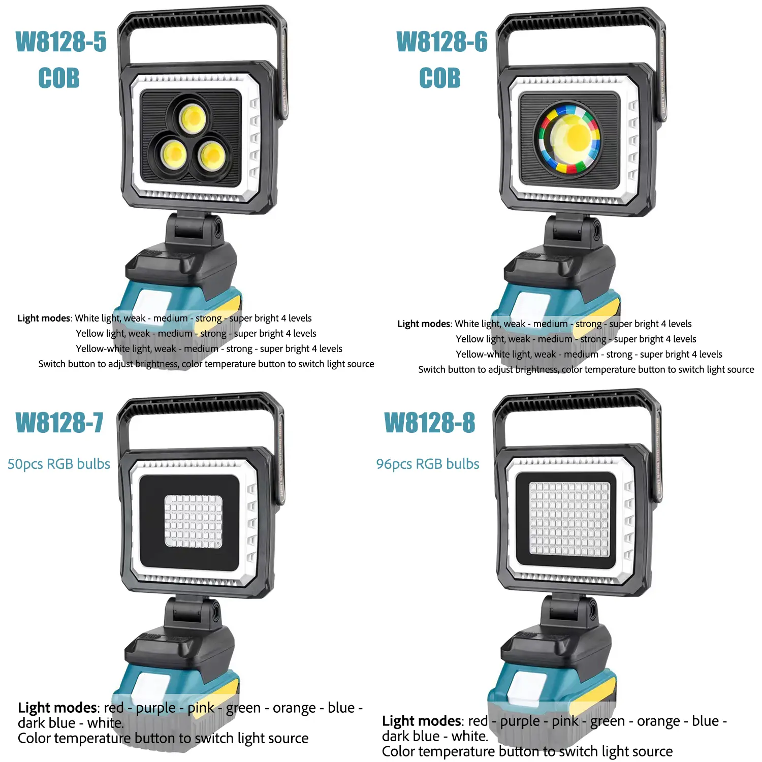 The W8128 Series Work Lights are engineered for professionals and outdoor enthusiasts who demand versatile, high-performance lighting. Built with shockproof ABS+PC housing and 360° rotatable heads, these lights offer 4-level brightness adjustment, dual charging ports (Type-C/DC), and compatibility with major power tool brands (Makita, DeWalt, Milwaukee, Bosch). Choose from SMD, COB, or RGB models to fit construction sites, emergency repairs, camping adventures, or creative events.