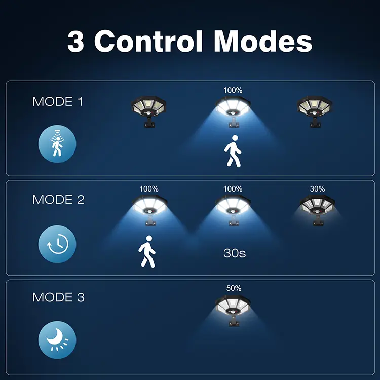 This solar lamp has three different working modes, which can automatically adjust according to different environments and needs to meet the lighting needs of different occasions.