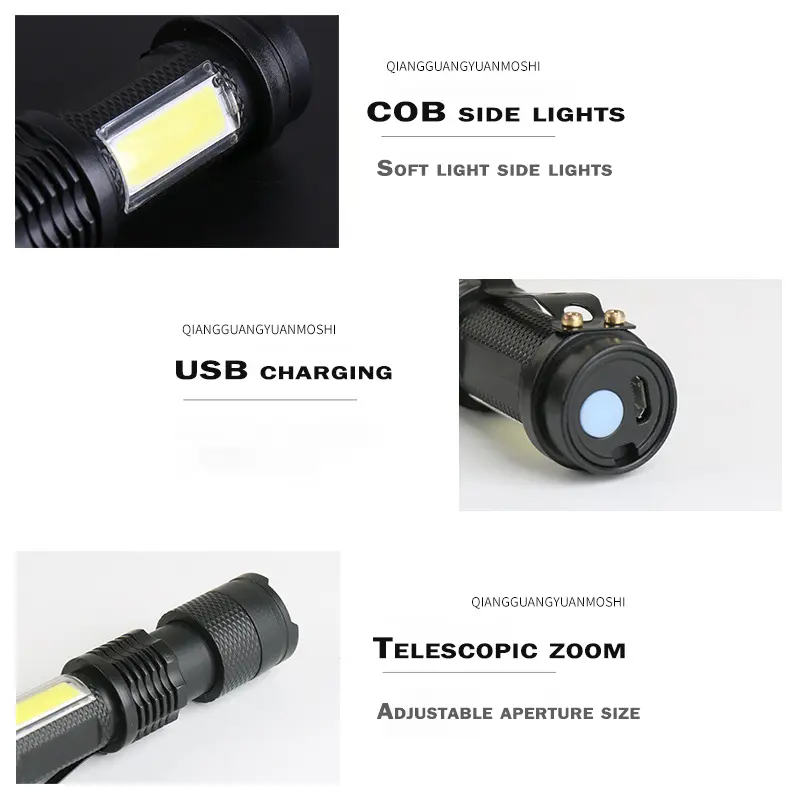 【 Flash in an instant 】 Promotional small flashlight, it is small and exquisite, as easy to hold. The main light can be zoomed in, combined with the COB floodlighting of the side lights, absolutely meeting the needs of different scenes. Very user-friendly design, easy to charge, USB interface can be charged anywhere.